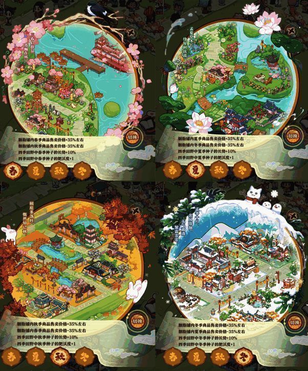 当然,整顿好竹马县大地图的商业布局也十分关键。在大地图合理美观地布局建筑,可以在装修城镇的同时让经营版图更加庞大。游戏局内还会有春夏秋冬四季变化,每个季节商品售卖价格和农作物特性都不一样,景色也各有千秋,玩家可根据自己的喜好和需求进行切换。