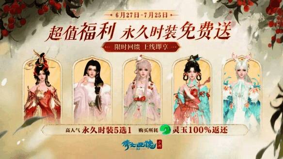 而今年的0元购 仍然只需消耗300灵玉,即可从5款返场时装当中任选1款获得,同样也是永久款式,同样也是购买所消耗的灵玉100%返还!