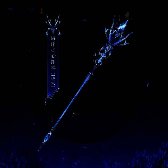 武器拓本【海洋之心】以蓝色为主调,通体流光溢彩,杖尖镶嵌着一颗宝石,杖身上有微型洋流在缓缓流动。