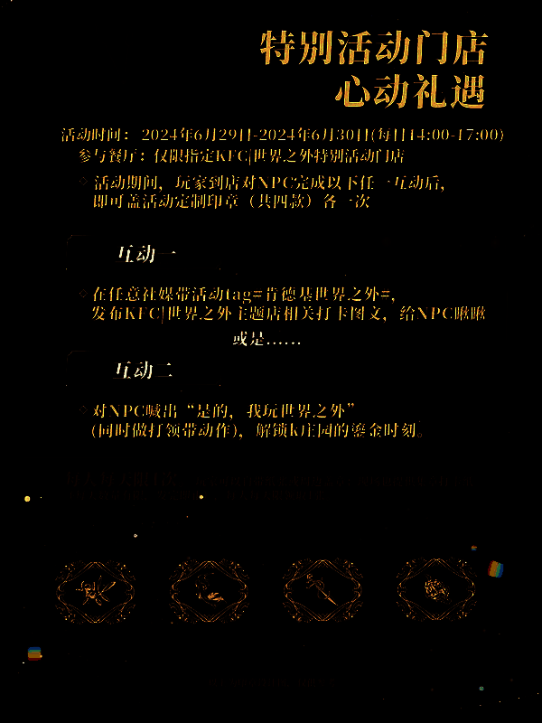 2024年6月29日-30日,KFC | 世界之外特别活动门店将于每日14:00-17:00时段开启彩蛋盖章活动。玩家到店对NPC完成以下任一互动后,即可盖章活动定制印章(共四款)