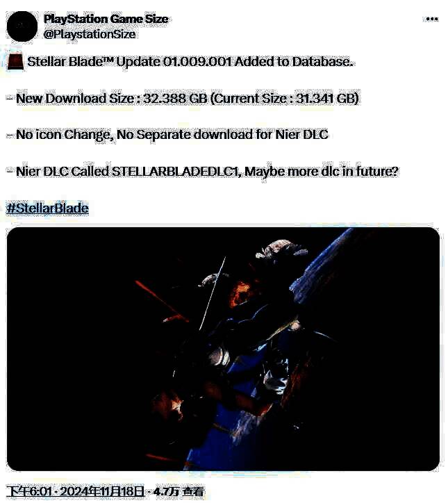 近日,知名爆料推主PlayStationSize发文透露了《星刃》的新补丁下载大小,约为32.341GB,版本号01.009.001,这是新照片模式和《尼尔》联动DLC的更新补丁,其中《尼尔》DLC无需单独下载,并被称为“STELLARBLADEDLC1”,这可能暗示了未来《星刃》会推出更多类似的DLC内容。