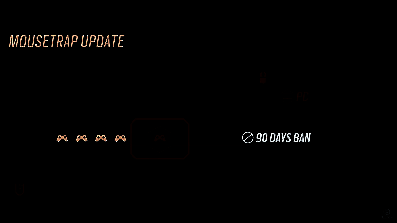 另一方面,应对在主机上使用键鼠的作弊者,育碧将推出名为“MouseTrapV2”的全新功能作为新跨平台系统的一部分。在被检测到后,使用硬件外挂转换器键鼠的主机玩家在被检测到 3 次以后将被封禁 90 天,并被强制移至 PC 玩家匹配池。另外,对于其他作弊,游戏添加了类似《无畏契约》的比赛取消系统,在检测到比赛中存在作弊者时,会封禁作弊者,并且取消整场比赛。