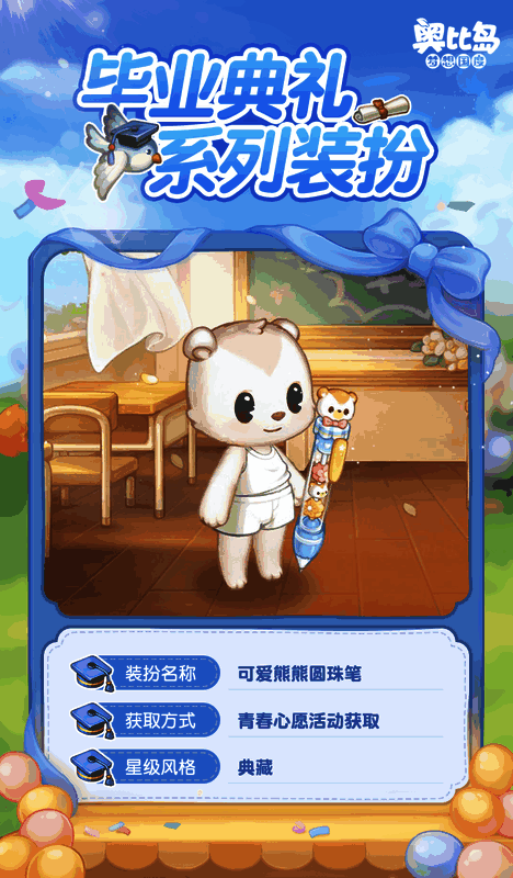 在绝版的限定夏日,把青春与梦想缠绕在一起,开启人生的新篇章!6月20日,「毕业季」限时活动开启,来参加一场特别的毕业典礼吧!参与「毕业季」限时活动可获得活动限定礼物,奖励包括「可爱熊熊圆珠笔」「青春少女音符眼」「音符猫耳发箍」「青春链条小马甲」「青春格纹蓬蓬裙」「甜酷吊带上衣」「阳光少年温柔眼」「阳光校园制服」「阳光少年运动鞋」等限定装扮,以及「毕业派对花束」「毕业派对地毯」「毕业派对纱窗」「毕业派对黑板」「毕业派对课椅」等限定家具散件,还有全新的头像框、背景卡、左装饰「青春心意书包」、双人座椅「趣味三角尺」和晨星品质称号等超多惊喜礼物!此外,在本次活动中完成全部物品收集的小奥比,还可获得限定装扮「空间开场(匆忙)」!