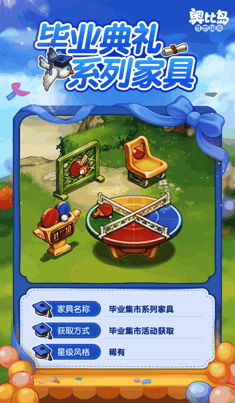 小奥比们在「毕业季」活动收集“校园纪念币”,就可免费兑换「猫咪吐司头套」「喵喵计算器」「毕业快乐帽」「毕业小礼袍」等装扮,以及「乒乓球比分板」「乒乓球观众小椅」「乒乓球彩色桌」等家具,诸多限定好礼,小奥比们别错过!