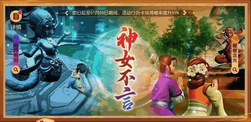 神女不言,暧暧含光。全新女娲像知交逸闻-【神女不言】已于2024年6月19日在【镜中奇缘】开启。本期逸闻中所包含的行历卡有金卡【暧暧含光】,紫卡【明月有泪】。首次完成逸闻剧情必得【镜中花】、【珍藏的回忆碎片】,概率获得蓝卡【第十一回 山河劫】。