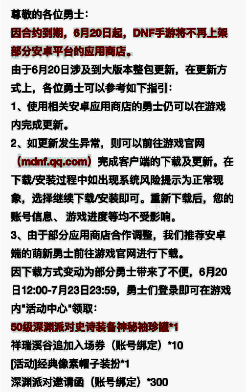 根据官方之前放出的公告,从6月20日起,DNF手游将不再支持部分安卓平台的应用商店,如果你是来自这些应用商店的新用户,需要前往DNF手游官网下载安装包。老玩家要更新版本则可以直接在游戏内完成,如果更新出现异常,同样也可以移步官网下载最新的版本。另外要注意,如果安装过程中出现风险提示,只需忽略掉继续完成安装即可,更新后玩家的账号信息、和游戏进度都可正常使用,不会受到影响。