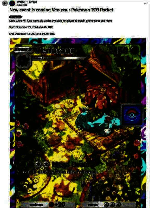 据reddit用户“toma_suka”爆料,12月会有类似现在已经结束的拉普拉斯卡组对战活动。但玩家将面对以妙蛙花为主要卡牌构筑的卡组,并且在挑战成功后有概率(39%)获得商店券(推测为可用于兑换活动限定卡牌),以及开包沙漏和闪亮沙子作为奖励。