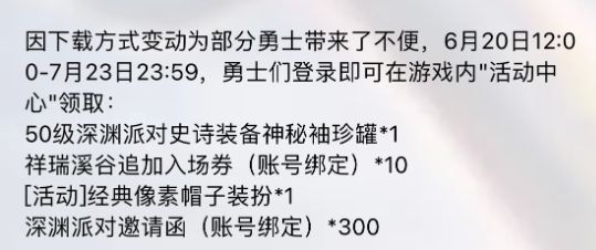 作为应用商店平台变动的补偿,官方为所有玩家准备了相应的福利:50级史诗装备神秘袖珍罐*1、祥瑞溪谷追加入场券(账号绑定)10、[活动]经典像素帽子装扮1、深渊派对邀请函(账号绑定)*300。这波福利相当实用,不仅包括需求量很大的深渊门票,还有50级史诗装备袖珍罐,可以随机开出一件50级的史诗装备,说不定你离毕业就差这一个罐子。