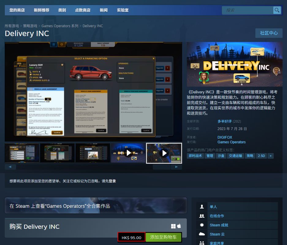 《Delivery INC》是一款由DIGIFOX制作Games Operators发行的策略游戏。而这款游戏的售卖版本目前只有标准版,标准版售卖价格就是港币95元。