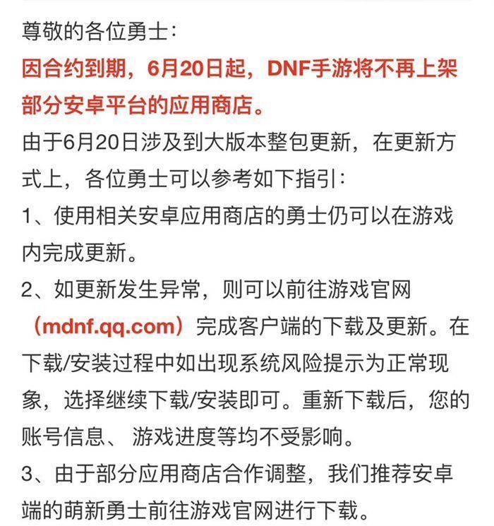 此外,官方近期发布了一则公告,目前由于DNF手游官方与部分应用商店合作调整,DNF手游将不再上架部分安卓平台的应用商店。已下载玩家可直接登录游戏更新,而新玩家则需前往官网下载新版本。