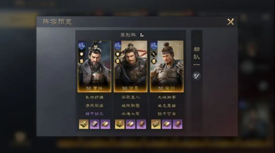 此外,抽到核心武将曹操的可以组曹操、徐晃、张郃双封阵容,如果没有曹操,有于禁也是可以的,核心思路就是由高伤倍率的武将搭配于禁、徐晃。开荒阶段围绕有高伤倍率输出技能的武将来搭配效率奇高,主力二队组建原理与一队等同。