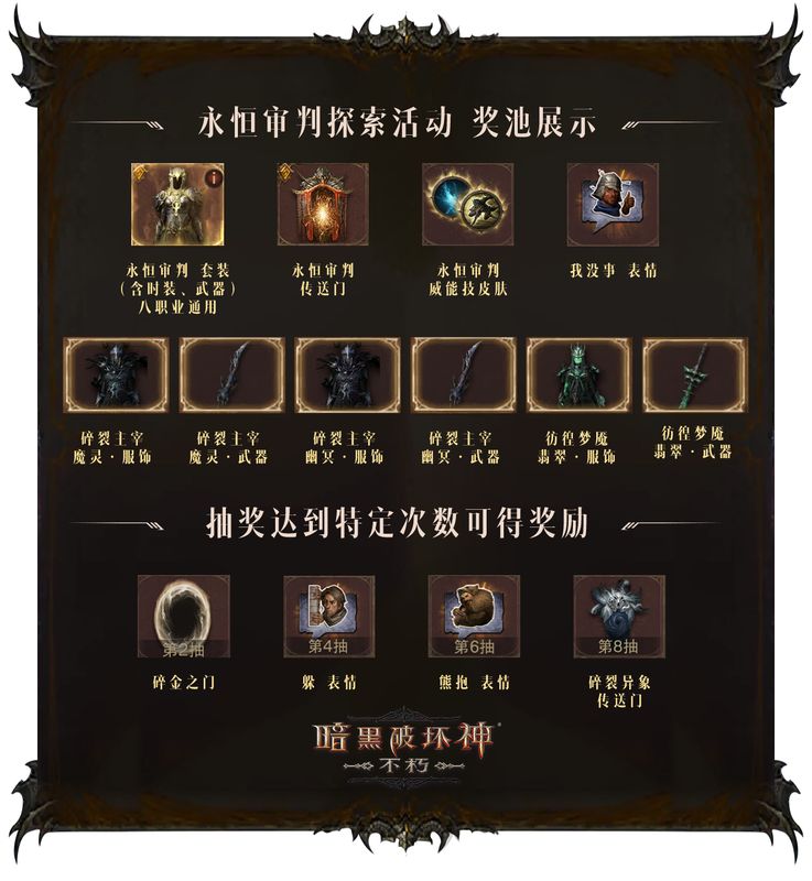 奖池内包含“永恒审判”时装、“永恒审判”威能技皮肤、“永恒审判”传送门、“碎裂主宰-魔灵”服饰和武器、“碎裂主宰-幽冥”服饰和武器、“彷徨梦魇-翡翠”服饰和武器、表情“我没事”!勇士们,赶紧前往游戏内参与活动,共历庇护之地命运迭起,见证伊纳瑞斯陨落之时!首次参与探索活动免费,累计探索次数达到2抽、4抽、6抽、8抽时可额外获得传送门“碎金之门”、表情“躲”、表情“熊抱”、传送门“碎裂异象”,探索满十次后立即解锁以上所有奖励!此外,解锁伊纳瑞斯时装【永恒审判】还可领取【永恒审判·光环】(限时)和【永恒审判·连击高光特效】(限时)!
