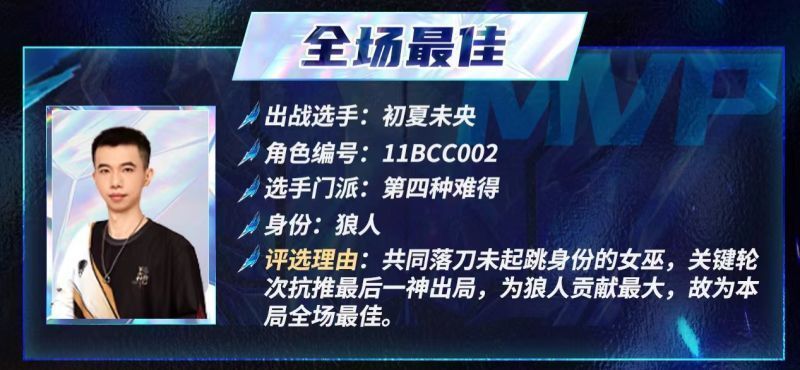 第三周的赛程对局已经圆满结束,6月13日的对局中,来自第四种难得门派的选手初夏未央,在关键轮次抗推最后神职出局,力挽狂澜,拿下当局游戏的胜利及全场最佳。