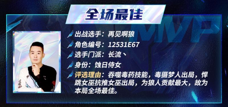 来自长流门派的选手再见啊狼,在拿到蚀日侍女身份牌的情况下,不仅成功吞噬到女巫的毒药技能,还将摄梦人直接毒出局,并将自己成功伪装为女巫,精湛的演技也让他拿下了这一局的游戏胜利。