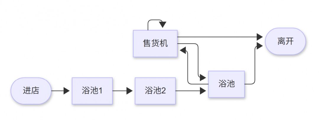 顾客在某轮买东西中不会去同一名字的售货机,无论是否买到(缺货或者恰好有动物占据),直到重新回到浴池。