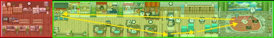 可以画一个 楼梯→毛巾架→浴池→售货机→回收箱→楼梯 的圈,基本就是顾客的移动路线。圈之外的地方顾客是不会去的。使用这个方法布局,就可以轻松控制顾客会去的设施和不会去的设施,得到想要的效果。