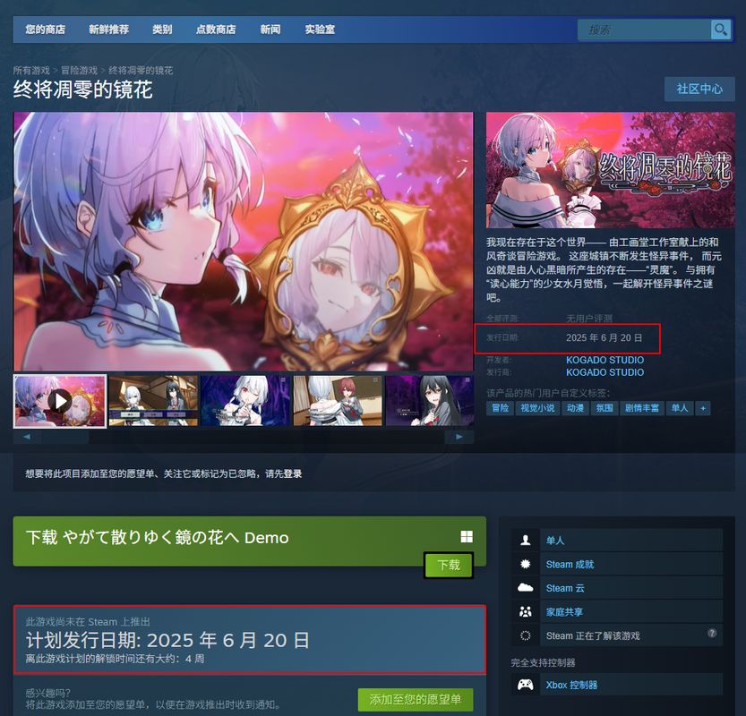 《终将凋零的镜花》Steam版的上线时间为2025 年 6 月 20 日,预下载时间大概是前一天,也就是6月19日。