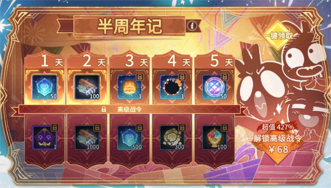 活动期间,累计登录一定次数可以获得「半周年头像」、「游园会头像框」和「万能进化光谱」等奖励!解锁“高级战令”,即可解锁「紫色起源盘」等奖励!