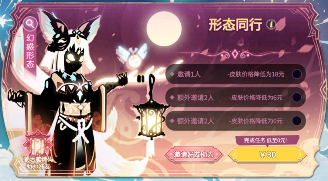 活动期间,探索者可邀请好友协助进行砍价助力,最高可将价格砍至0元,即探索者可以免费获得【玖璃幻惑形态】。