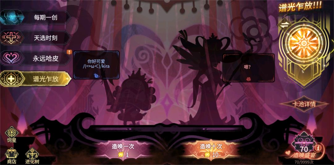 版本更新后,造唤台开启卡池——谱光乍放,探索者可以从卡池中选定一个自己最心仪的进化光谱进行“选择定向”,选择后造唤获得进化光谱时有35%概率为选定的进化光谱。