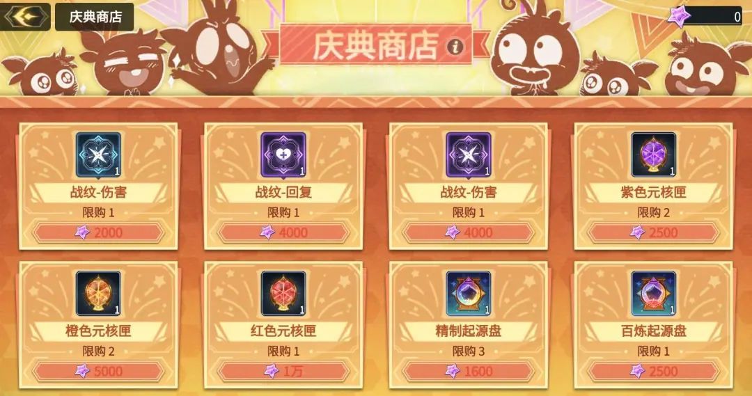探索者可以使用在「半周年」主题活动中获得的活动道具“糕星”在庆典商店中兑换各类道具,如造唤许可*10、红色品质元核、紫色品质战纹、极化石、起源盘、版本专属头像框等。