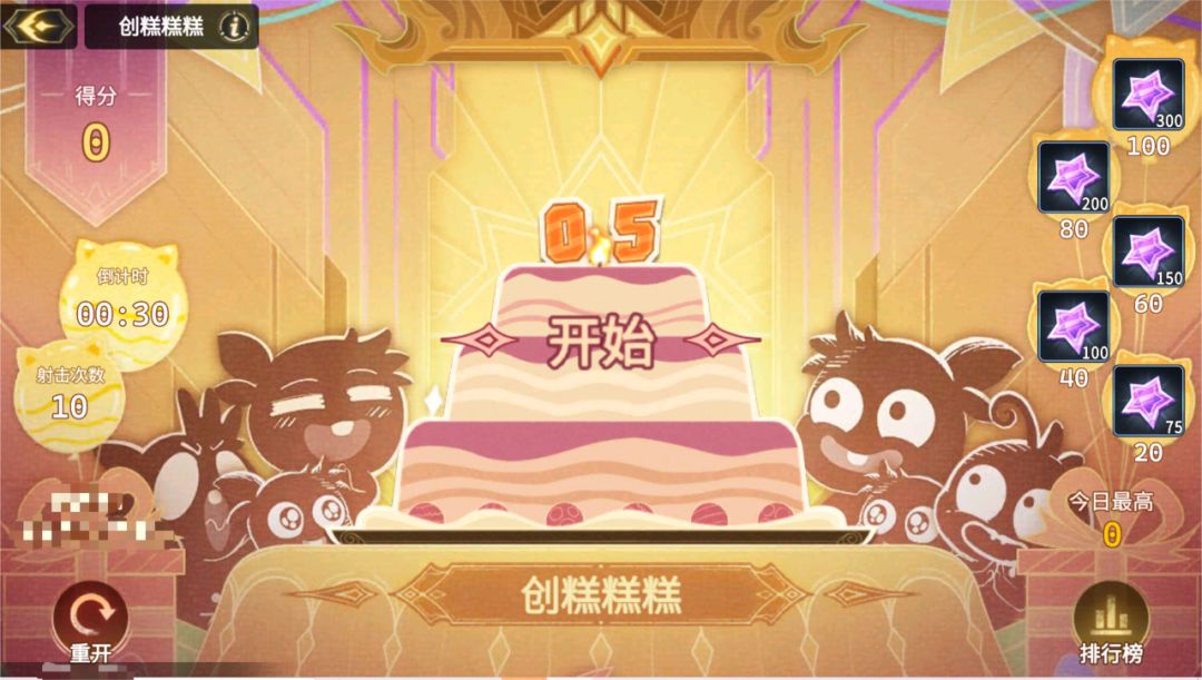 制作半周年蛋糕,庆祝超2半岁,注意别被围观的叉叉偷吃了!抓准时机向蛋糕基底发射材料制作蛋糕,获得更多得分!游戏到达一定分数后可获得对应奖励。