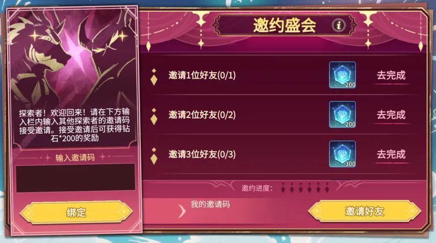 是时候唤醒沉睡的老友了!活动期间,探索者可通过分享邀请码,邀请多位久未上线的老友重回超进化大陆,邀请成功即可获得对应的邀约奖励!重新登录游戏即可刷新邀约进度。