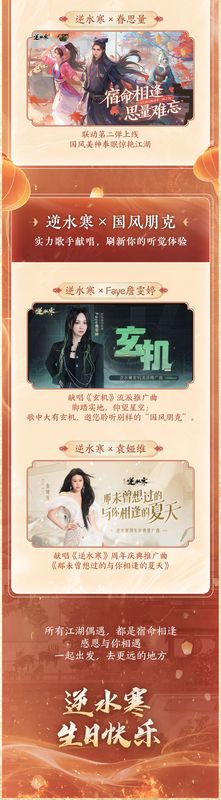 周年庆典将至之时,国风天团2.0也将惊艳来袭,实力歌手袁娅维、Faye詹雯婷、黄龄等大咖都将入驻会呼吸的江湖!联动也异常精彩:中华民族精神图腾之一的经典巨作《西游记》也打破六界束缚来到了逆水寒,开启重磅的【西游篇特别国风企划】;国画风知名IP“吾皇猫”、经典影视《铠甲勇士》、国风动漫《眷思量》联动第二弹、优秀国产游戏《阴阳师》等联动也将震撼来袭……跨越千年的国风精粹,遇上多元的潮流文化,将在逆水寒手游2.0版本迸发前所未有的全新国潮火花!