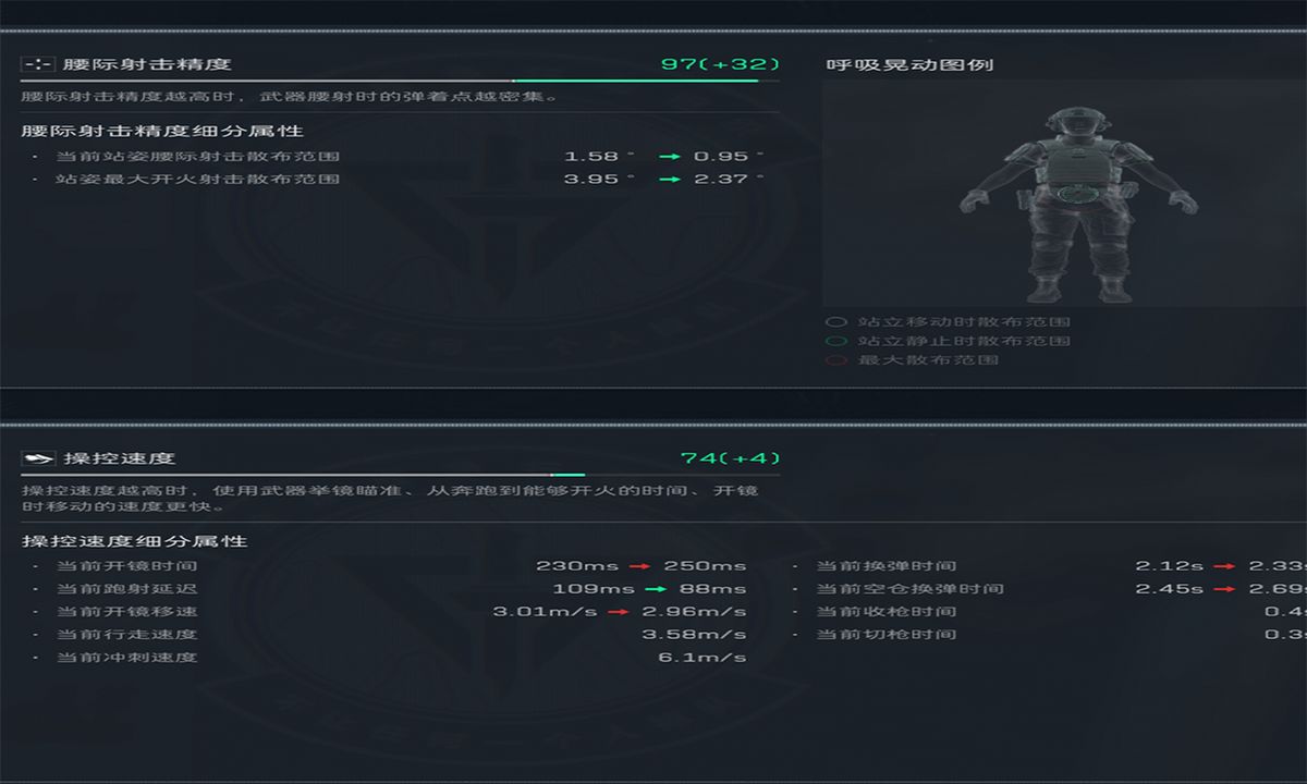 操控速度综合评分提升4点至74,细分属性中 “跑步延迟”从109ms缩短至88ms(即从奔跑切换到开火的响应时间更快),“冲刺速度”维持6.1m/s(机动性未受负面影响),整体提升了武器的战术灵活性和近距离作战中的反应效率。。