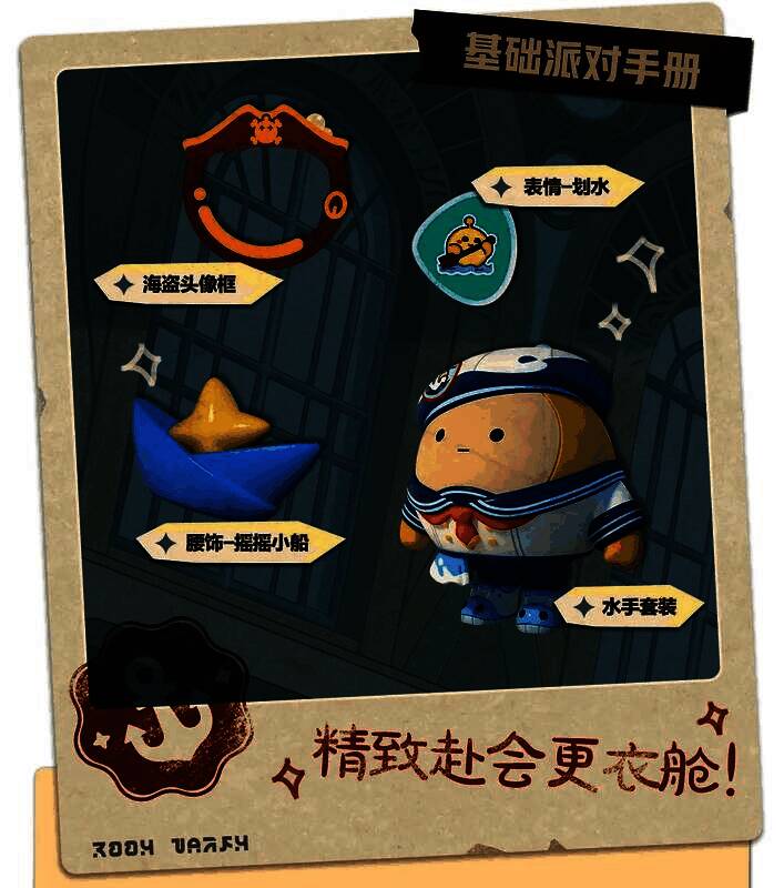 “宝船拍卖夜”派对季的派对手册分为基础版和高级版两部分,相应的奖励各不相同。本季基础派对手册的全部奖励有:800潮流纤维、17500瓶盖、稀有表情“划水”、高级头像框“海盗头像框”、稀有配饰“摇摇小船”、高级装扮“水手套装”。