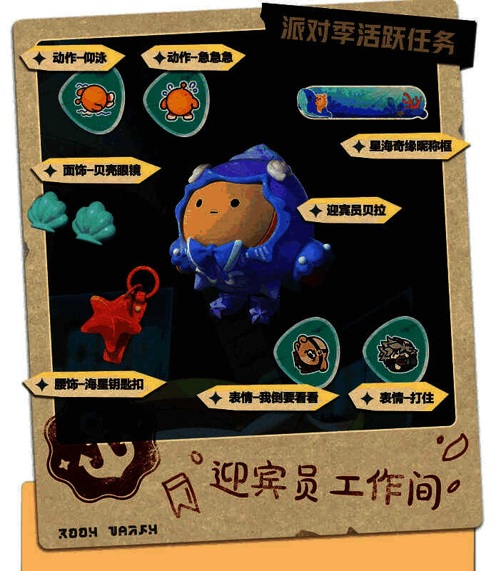 “宝船拍卖夜”派对季活跃活动正式开放!完成全新派对季活动任务,即可前往兑换商店获取稀有盲盒“迎宾员贝拉”、稀有配饰“贝壳眼镜”、稀有配饰“海星钥匙扣”,更有赛季限定全新表情“我倒要看看”、“打住”,动作“仰泳”、“急急急”,和“星海奇缘昵称框”等奖励等待兑换。