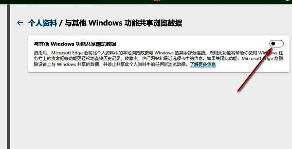 3、然后在新的界面中,就可以看到右侧中的“与其他Windows功能共享浏览数据”,最后将其开关按钮打开就可以了。
