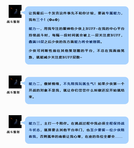 夏天到了,来自北极光、但怕热的四只刀刀策划鹅到达南极避暑,经过长途跋涉后在此处各自圈地修养。进入《南极之巅》的挑战场地后,少侠将看到以战斗策划为主的中央大平台,以及文案策划、数值策划、系统策划各自占领的三个小平台。