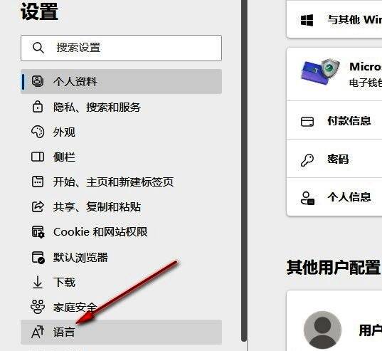 3、进入到“设置”界面之后,点击左侧栏中的“语言”选项。
