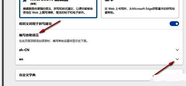 4、然后找到右侧中的“编写协助语言”选项,并点击“en”右侧的箭头图标。