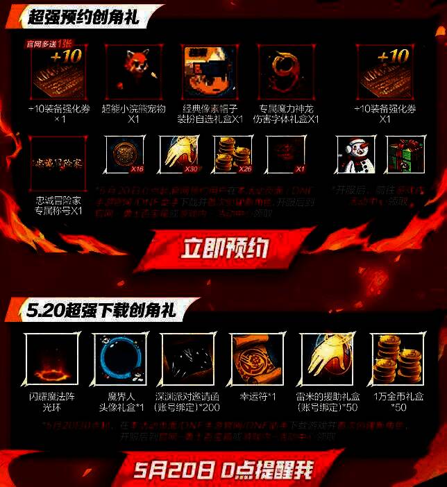 请一定!一定!从5月20日0点起,在DNF手游官网、DNF助手、App Store(苹果应用商店)参与活动并首次创建新角色,5月21日9点开服后到官网-勇士百宝箱或游戏内-活动中心领取。