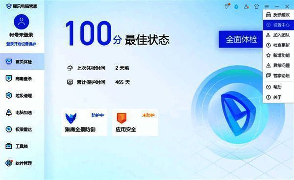 2、腾讯电脑管家主页面中点击右上角的三条横线图标,出现的窗口中点击设置中心。