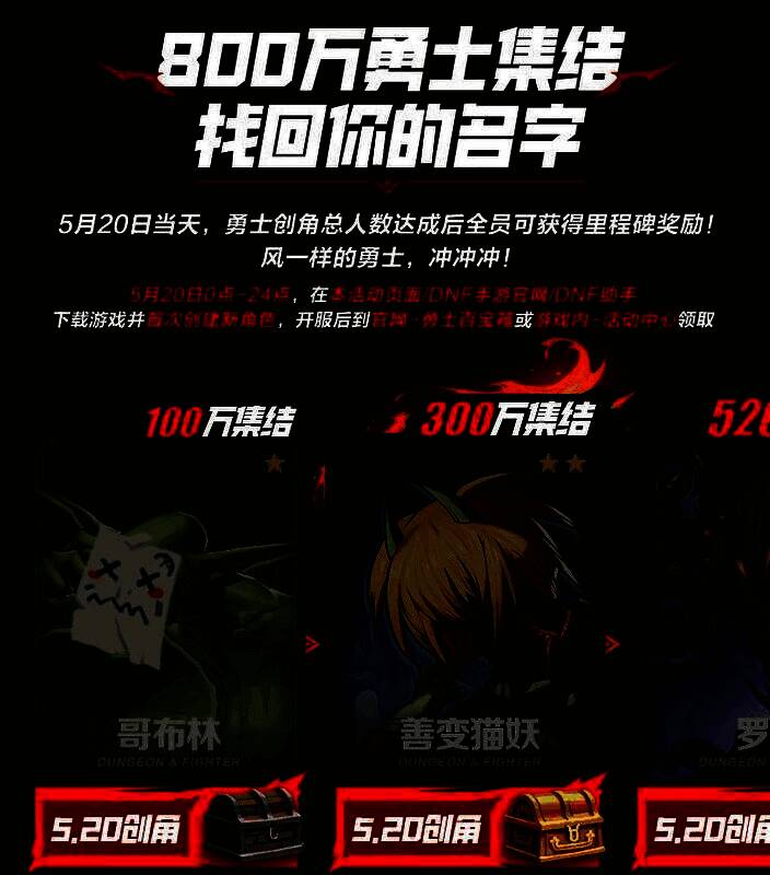 5月20日当天,勇士创角总人数分别达成100W、300W、520W、800W后,全员可瓜分里程碑奖励!更有部分幸运勇士可获得惊喜掉落大奖,期待一下!