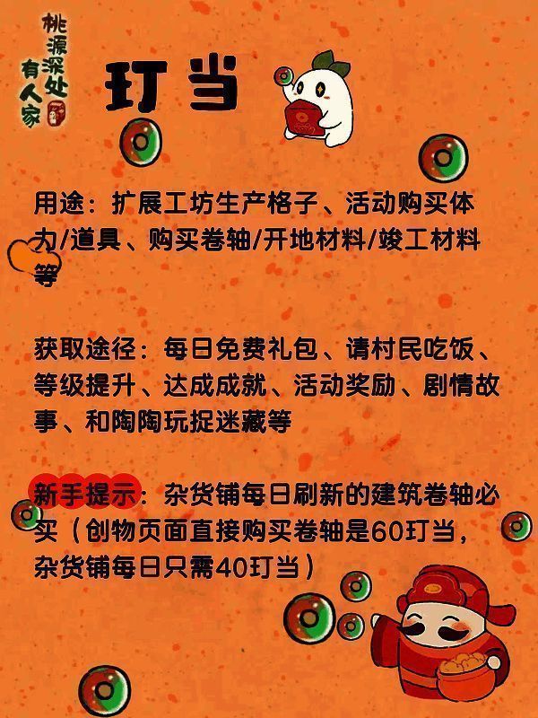 在桃源深处有人家游戏中,萝萝山的建设离不开货币,【玎当】是常见货币之一,主要可用于扩展工坊生产格子、活动购买体力/道具、购买卷轴/开地材料/竣工材料等,可通过每日免费礼包、请村民吃饭、等级提升、达成成就、活动奖励、剧情故事、和陶陶玩捉迷藏等途径获取玎当。