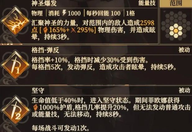 玩家如果想对菲欧娜进行天赋加点的话,它主要是围绕着生存能力控制能力以及整个团队的辅助能力进行的。对于玩家来说,在天赋方面,玩家可以直接选择格挡跟弹反,因为它的核心就是生存跟控制。如果说实现高频率的格栅能够有效地降低整个团队的承伤效果,而在弹反方面的话能够眩晕,一旦boss眩晕之后,他的技能循环将会被打断,将它的格挡跟弹反满了以后,玩家就开始选择他的被动技能二坚守。说到这个技能的话,其实它在绝境当中是能够翻盘的,所以说这个技能也是特别重要的。毕竟当菲欧娜的生命值低于40%的时候,将会触发坚守技能,这时候将会获得1000%的护盾,而它的格挡概率也将会提升20%,这样的状态其实能够持续8秒。