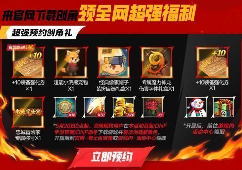 但是比较下来,官网和助手的预约奖励将更加丰富一些。除了其他渠道没有的像素头、超能小浣熊宠物、神龙伤害字体,忠诚冒险家称号、复活币、金币、雷米等道具之外,DNF手游官网和DNF助手预约更有额外一张+10强化券赠送!相当于在官网预约或者是DNF助手预约之后,上线即可领取两张+10强化券!