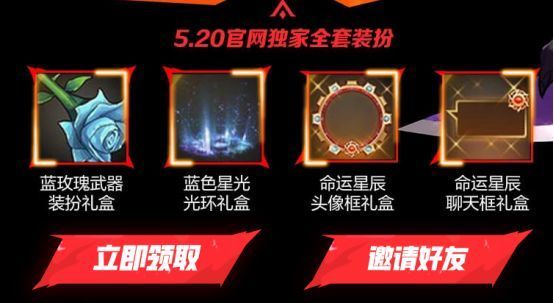 现在加码送“520全套装扮”,包括【蓝玫瑰武器装扮礼盒】、【蓝色星光光环】、【命运星辰头像框】和【命运星辰聊天框】。