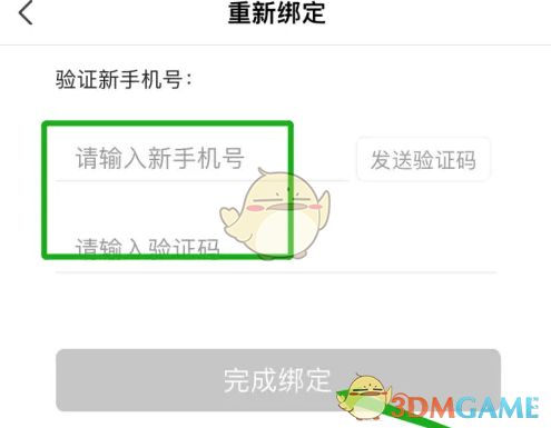 4、在下一个界面中输入需要更换的新手机号和验证码,之后再点击【完成绑定】即可。