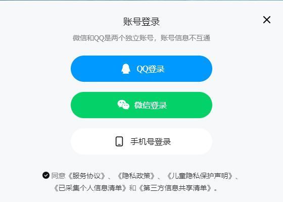 3、弹出的账号登录页面中,根据自己的绑定的账号选择QQ登录或者是微信登录。