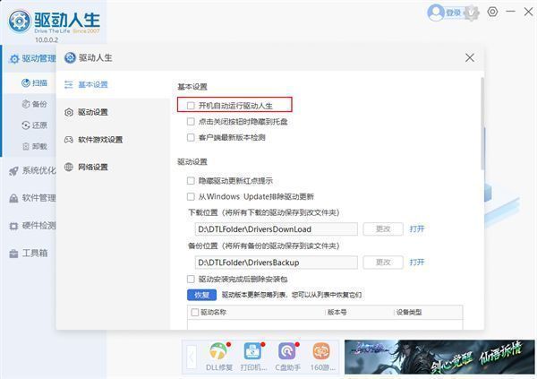 4、进入的设置页面中,在基本设置下可以看到开机自动运行驱动人生选项,将其进行勾选即可。
