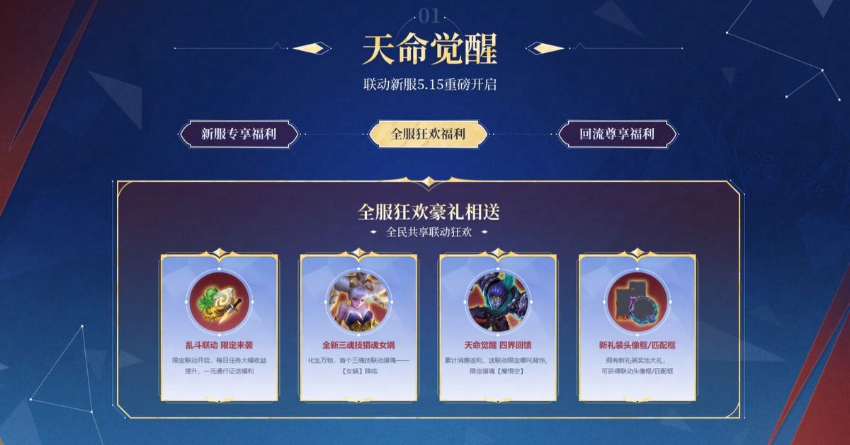 亲历西游的传说篇章,加入全新的联动狂欢,共享豪礼与天命者踏上西行之路!《猎魂觉醒》×《乱斗西游2》联动四大全服狂欢福利为各位游骑兵送上!每日任务大幅收益提升,一元通行证送福利;首个三魂技联动猎魂-【女娲】降临;累计消费返利,送联动限定哪吒背饰、限定猎魂【魔悟空】;拥有新礼装奖池大礼,可获联动头像框/匹配框。