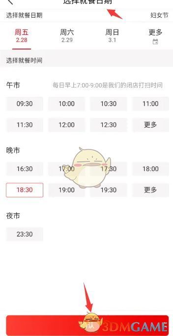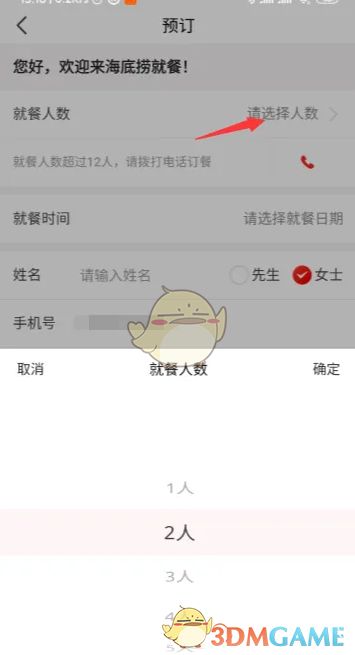 4、进入预订后,选择相应的就餐人数,就餐时间。