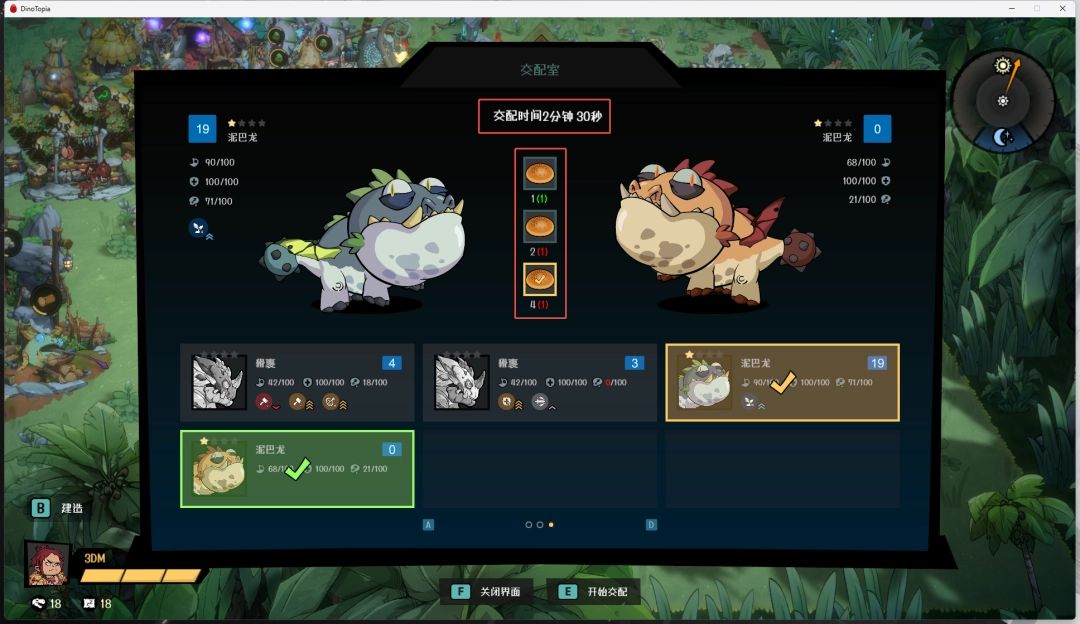 准备好两只迪诺兽后,将迪诺兽选中,然后再选择需要使用多少个精力大餐,消耗越多的精力大餐,那么交配时间越短,更加快速的刷所需迪诺兽蛋。如果资源紧缺,可以选择只使用一个面包。