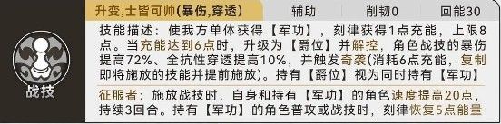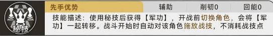 技能描述:使用秘技后获得【军功】,开战前切换角色,会将【军功】一起转移。战斗开始时自动对该角色施放战技,不消耗战技点