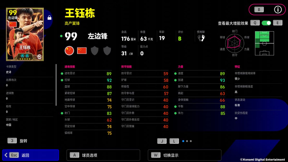89分速度,93分加速,还有92分的控球,让这位中国新星用风驰电掣的速度摆脱围追堵截,轻松完成致命一击!